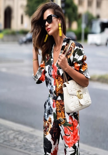 Les imprimés et motifs floraux sont les bienvenus sur l’option d’une combinaison d’été avec un short, qui donne à l’image légèreté et coquetterie.